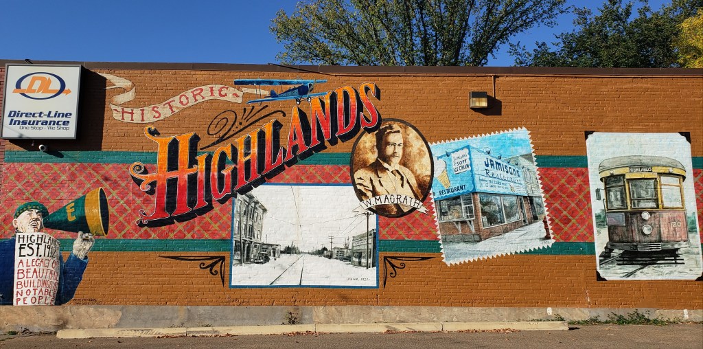 Larry commissioned the “Historic Highlands” mural on the east wall of his office building. He said he did this because he had seen many murals in “The City of Champions” and since he had a large blank wall he thought it would be wonderful to commemorate Highlands’ past in this way. His original idea was to centre the mural around a streetcar as streetcars used to run past the building but after some consultation with the artist (Ian Mulder) it was decided to widen the focus to include local buildings and a portrait of W. Magrath, founder of the Highlands. A mockup was done and Pete Jamieson, a non-Highlands resident, was added as he was an interesting local character known by many in Edmonton.